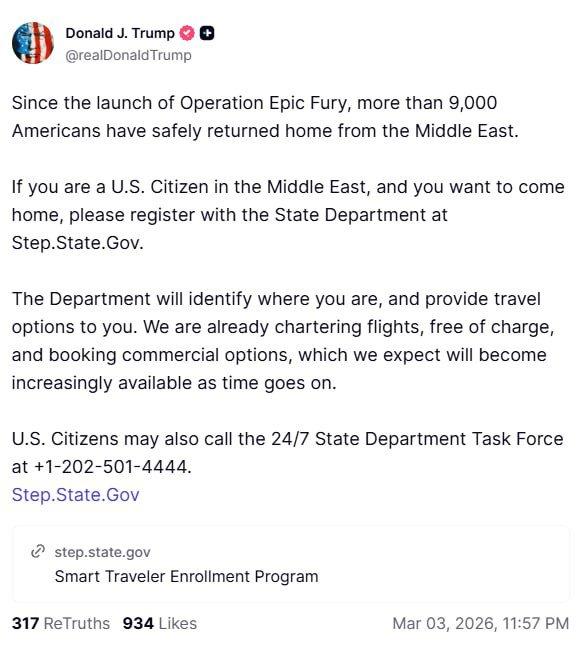 "AYRILMAK İSTEYENLER KAYIT YAPTIRMALI"Orta Doğu bölgesinden ayrılmak isteyen diğer ABD vatandaşlarını ABD Dışişleri Bakanlığı'na ait "Step.State.Gov" adresinden kayıt yaptırmaya çağıran Trump, "Bunu yaptığınızda, bakanlık nerede olduğunuzu belirleyecek ve size seyahat seçenekleri sunacaktır. Zaten ücretsiz uçuşlar düzenliyoruz ve ticari seçenekler için rezervasyon yapıyoruz; zamanla bunların daha da yaygınlaşmasını bekliyoruz" ifadelerini kullandı.