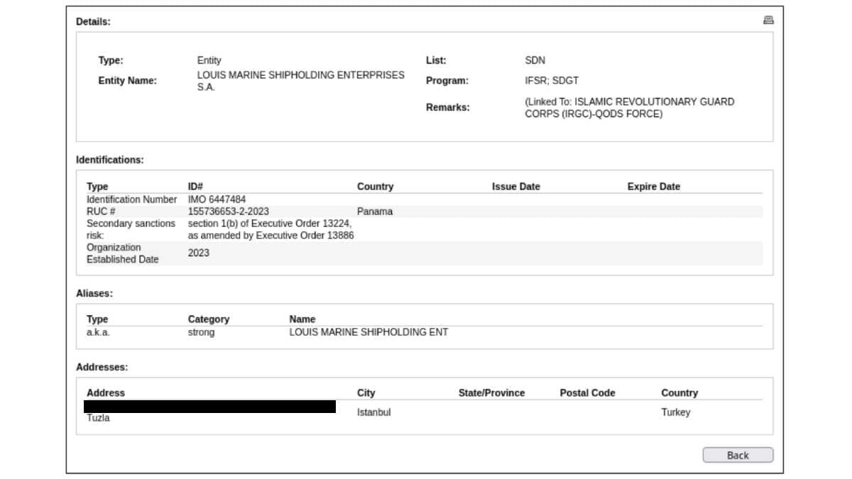 ABD'nin açık kaynak yaptırım veritabanına göre bu şirket, İran'ın İslami Devrim Muhafızları'na destek vermekten yaptırım listesine alındı. Yaptırımlar, 2023 yılında devreye girdi.