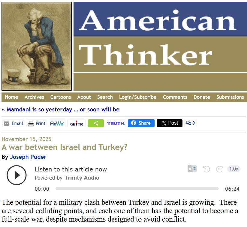 ABD'de muhafazakar çizgideki yayınlarıyla bilinen dergi American Thinker, Türkiye ile İsrail arasında askeri bir çatışma potansiyelinin giderek büyüdüğünü iddia eden bir analiz yayımladı. Yazıda, iki ülke arasında çatışmayı önleme mekanizmaları bulunmasına rağmen, her biri topyekûn bir savaşı tetikleme potansiyeli taşıyan birçok sürtüşme noktası olduğu vurgulandı.