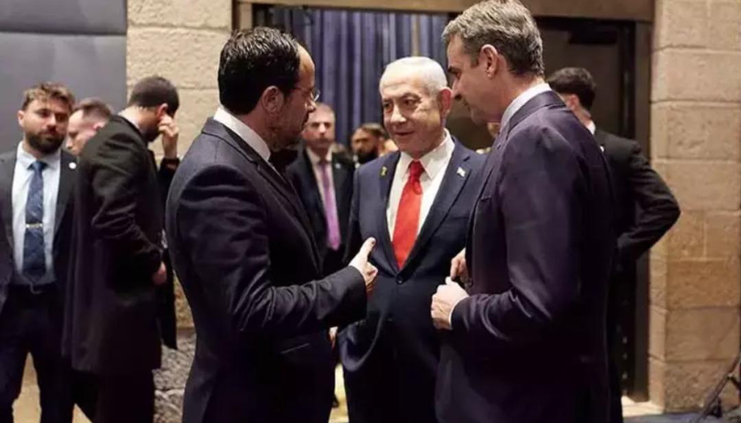 İsrail Başbakanı Binyamin Netanyahu, Yunanistan Başbakanı Kiryakos Miçotakis ve Güney Kıbrıs Rum Kesimi lideri Nikos Hristodulidis