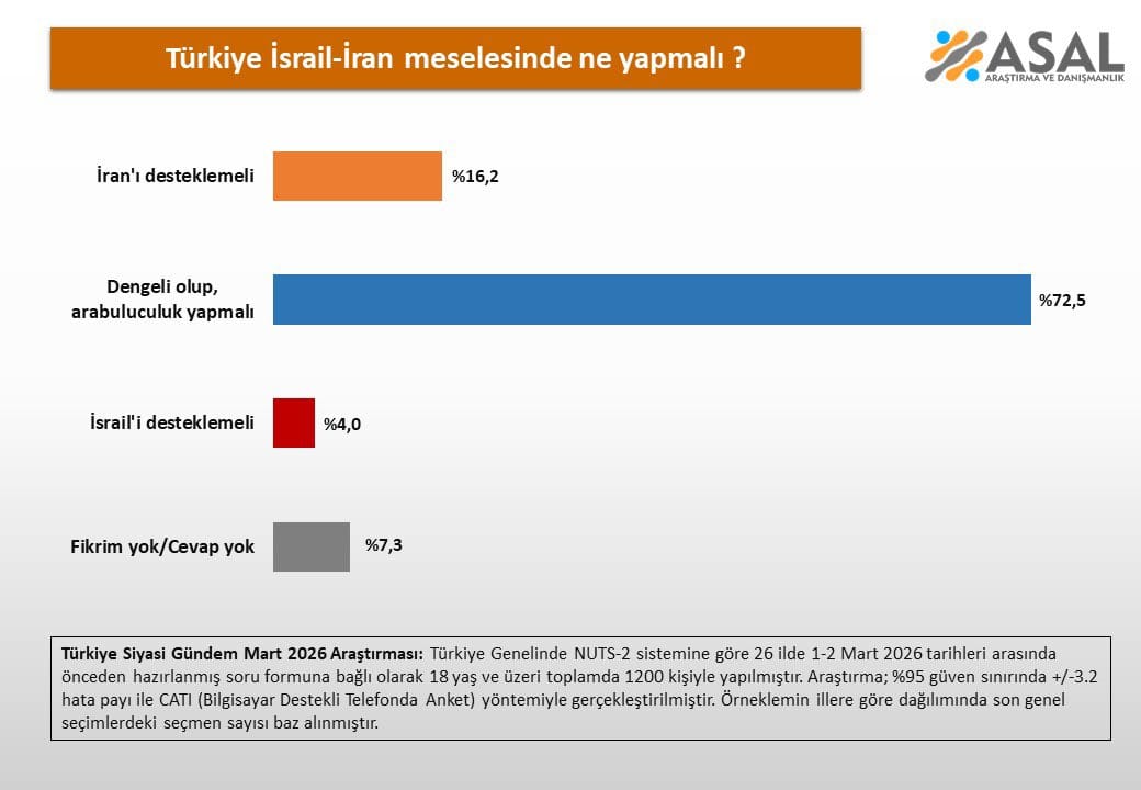TÜRKİYE, İSRAİL-İRAN MESELESİNDE NE YAPMALI?Araştırma, 26 ilde bin 200 kişiyle gerçekleştirildi ve katılımcılara “Türkiye, İsrail-İran meselesinde ne yapmalı?” sorusu yöneltildi.