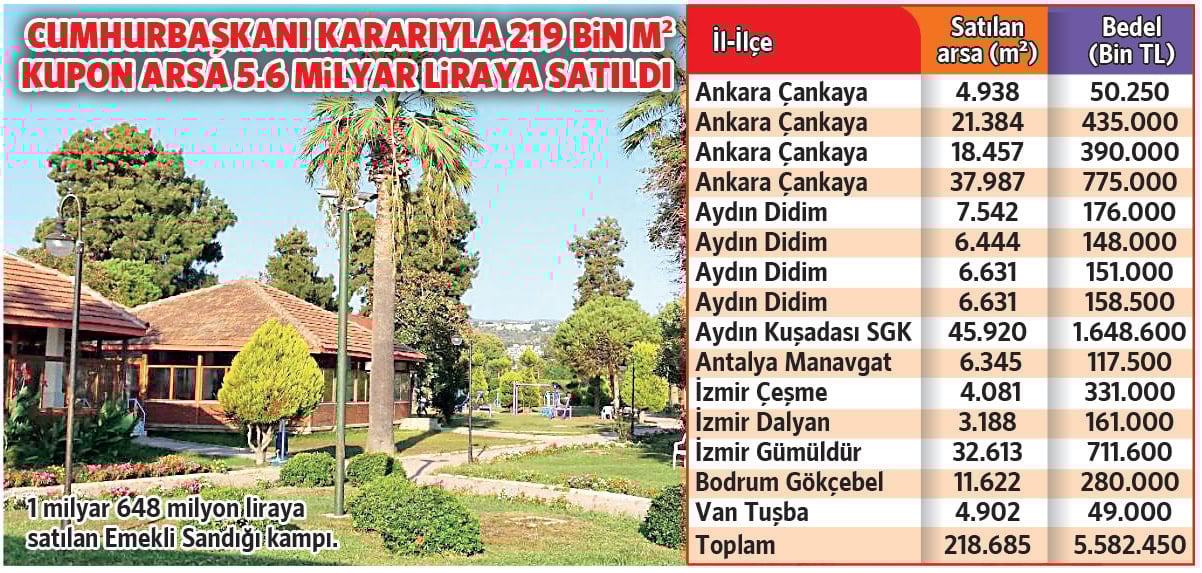 Emeklinin kamp alanının satıldığını ilan eden Cumhurbaşkanı kararıyla ayrıca Ankara Gölbaşı, İzmir Aliağa, Bursa Nilüfer, Antalya Kalkan’daki kamuya ait arsaların imarının değiştirilmesi için Özelleştirme İdaresi’ne yetki verildi. Aynı karar ile Ankara, İstanbul, Manisa, Aydın, Burs ve Muş’ta bulunan 10 kupon arsa da özelleştirme kapsam ve programına alındı. Çeşitli illerdeki birbirinden değerli toplam 218 bin 685 metrekare kupon arsa 5 milyar 582 milyon liraya satıldı.