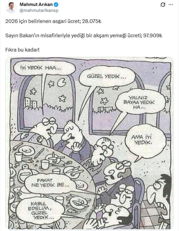 Tepki gösteren isimler arasında yer alan Saadet Partisi Genel Başkanı Mahmut Arıkan açıklanan rakama paylaştığı bir karikatür ile tepki gösterdi.