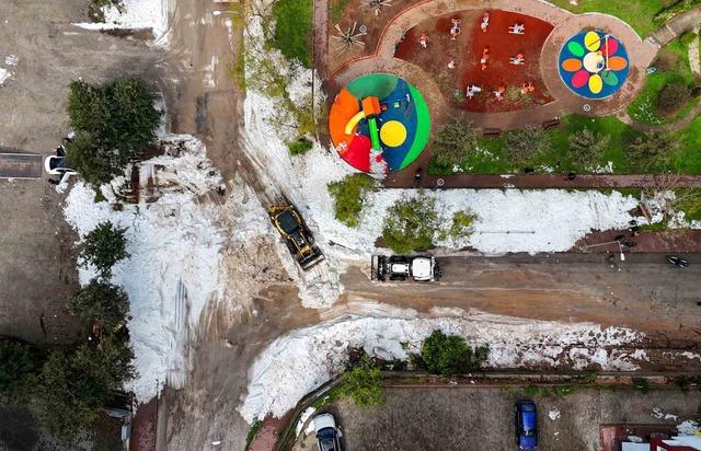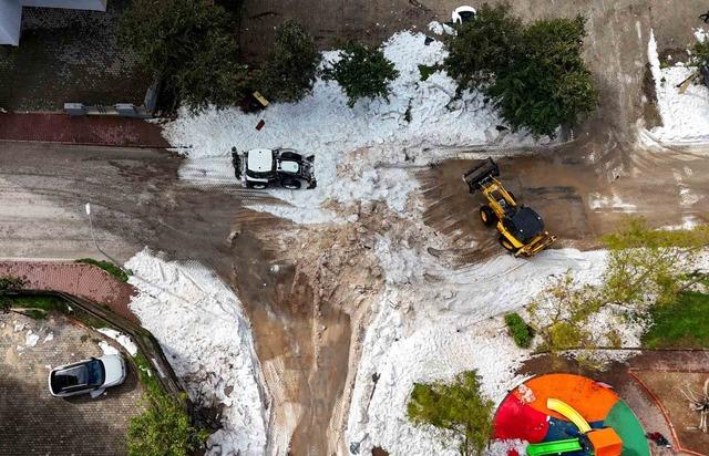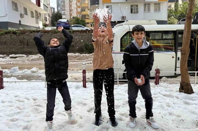 Türkiye’nin en sıcak illerinden Adana’da dün akşam etkili olan dolu ve sağanak yağmur nedeniyle merkez Çukurova ilçesine bağlı Huzurevleri Mahallesi’nde buz kütleleri oluştu. Sabah saatlerinde ise erimeyen kar kütlelerini gören çocuklar, soluğu parklarda aldı.
