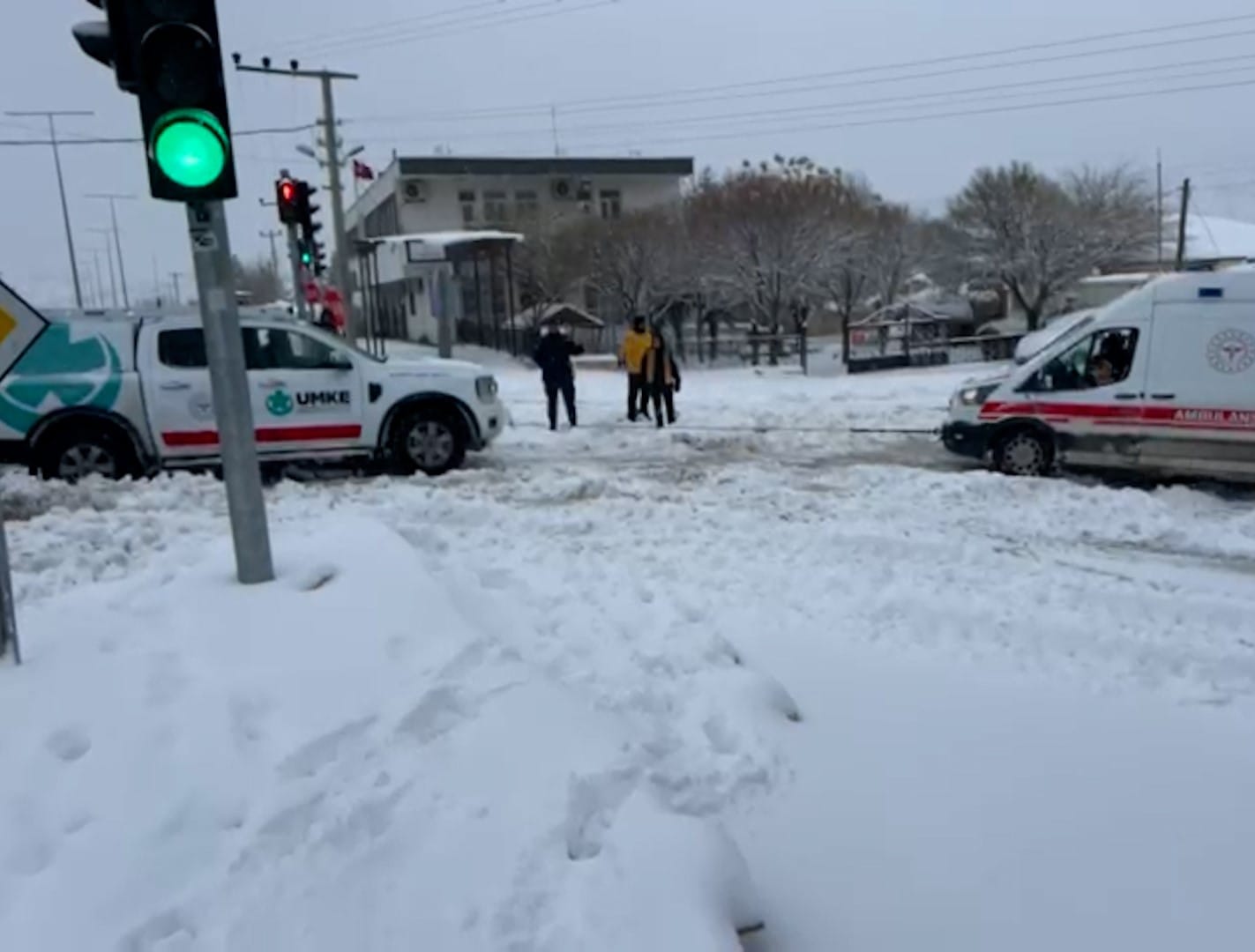 AMBULANS YOĞUN KAR YAĞIŞI NEDENİYLE KARA SAPLANDIAmbulans, iki hastayı aldıktan sonra hastaneye dönmek için hareket etti. Ambulans, bir müddet sonra dönüş yolunda yoğun kar yağışı nedeniyle kara saplandı.
