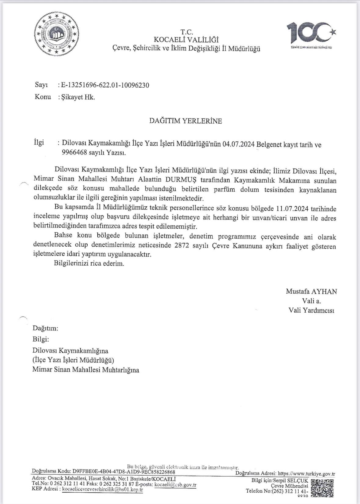 “Müdürlüğümüz teknik personellerince söz konusu bölgede 11 Temmuz 2024 tarihinde inceleme yapılmış olup başvuru dilekçesinde işletmeye ait herhangi bir ünvan/ticari ünvan ile adres belirtilmediğinden tarafımızca adres tespit edilememiştir. Bölgede bulunan işletmeler denetim programımız çerçevesinde ani olarak denetlenecek olup Çevre Kanunu’na aykırı faaliyet gösteren işletmelere idari yaptırım uygulanacaktır.”