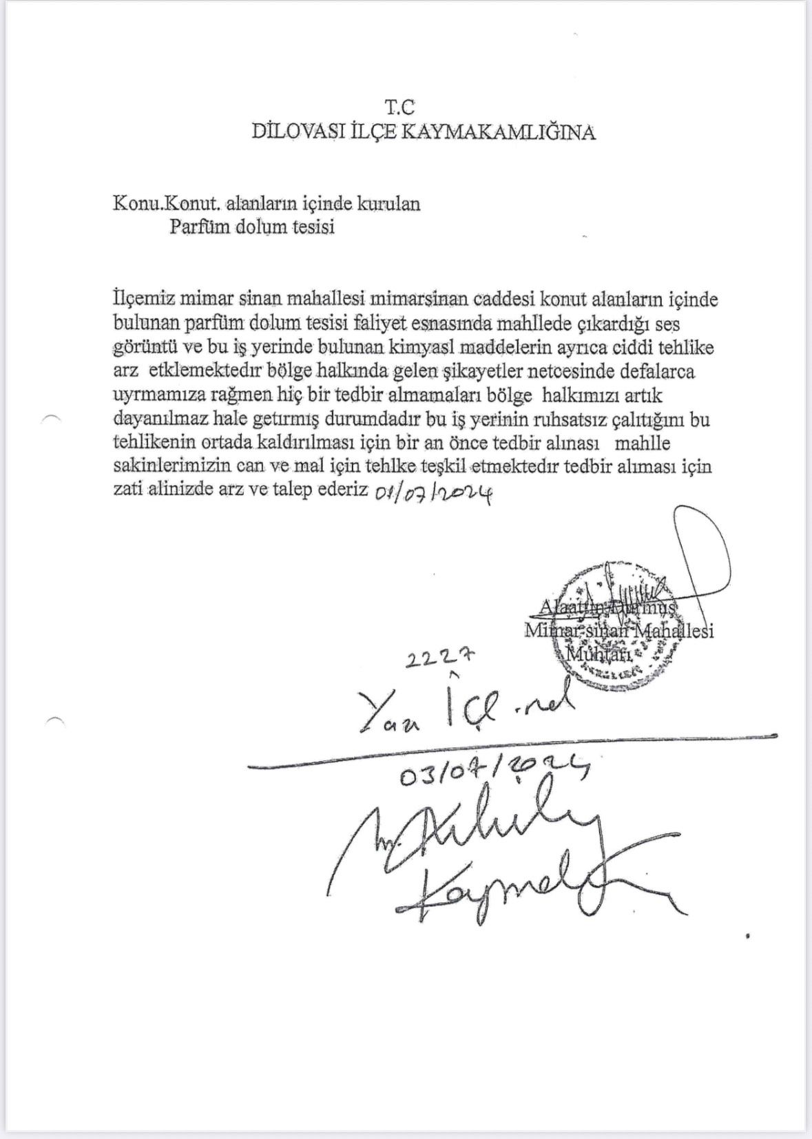 “Mimar Sinan Caddesi konut alanları içinde bulunan parfüm dolum tesisinin faaliyet esnasında çıkardığı ses, görüntü ve iş yerinde bulunan kimyasal maddeler tehlike arz etmektedir. Bölge halkından gelen şikayetler neticesinde defalarca uyarmamıza rağmen hiçbir tedbir almamaları artık dayanılmaz hale getirmiş durumdadır. Mahalle sakinlerimizin can ve malı için tehlike teşkil etmektedir. Tedbir alınması için zatı alinizden arz ve talep ederiz.”