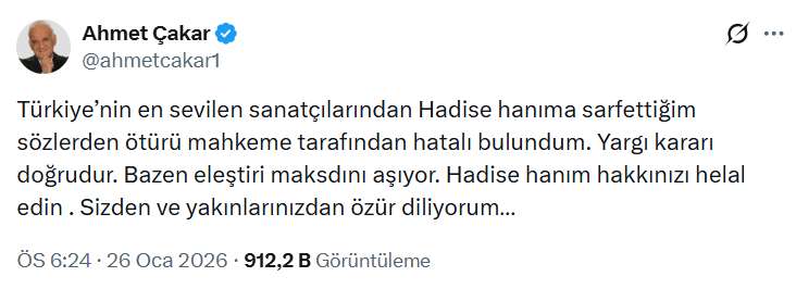 "Türkiye’nin en sevilen sanatçılarından Hadise hanıma sarf ettiğim sözlerden ötürü mahkeme tarafından hatalı bulundum. Yargı kararı doğrudur. Bazen eleştiri maksadını aşıyor. Hadise hanım hakkınızı helal edin. Sizden ve yakınlarınızdan özür diliyorum."