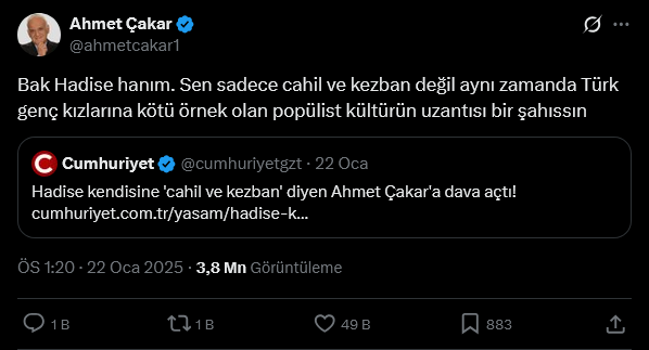Hürriyet'ten Özge Eğrikar'ın haberine göre; Hadise, 15 Aralık 2024’te yayınlanan “İbrahim Selim ile Bu Gece” programında özel hayatına dair açıklamalarda bulunmuştu. Bu açıklamalara Çakar, "Çakırkeyf" adlı YouTube programında tepki göstermiş ve Hadise’nin avukatı tarafından “"hakaret ve iftira" olarak nitelendirilen yorumlar yapmıştı.