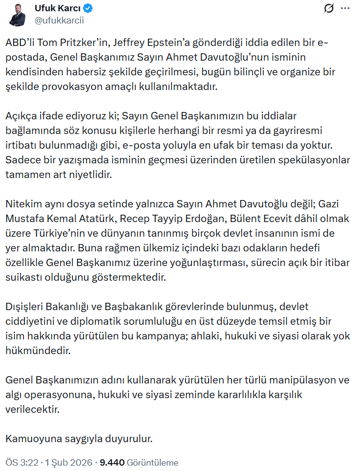 "ABD’li Tom Pritzker’in, Jeffrey Epstein’a gönderdiği iddia edilen bir e-postada, Genel Başkanımız Sayın Ahmet Davutoğlu’nun isminin kendisinden habersiz şekilde geçirilmesi, bugün bilinçli ve organize bir şekilde provokasyon amaçlı kullanılmaktadır.