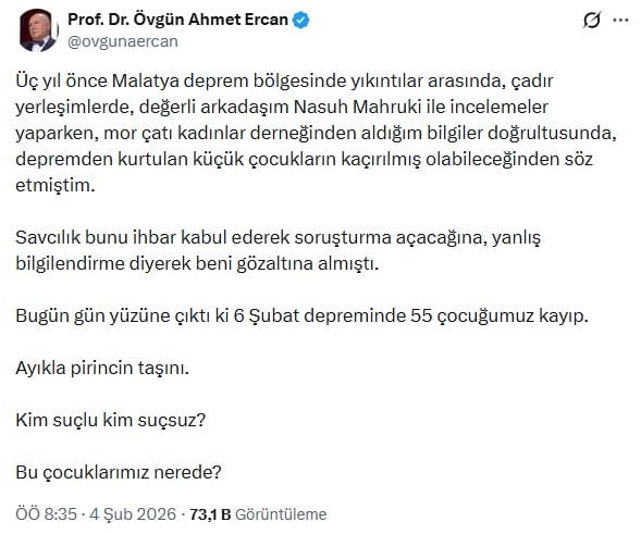'55 ÇOCUK KAYIP'Ercan konuyla ilgili X hesabında şu ifadeleri kullandı: