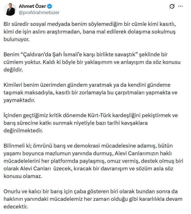 "Bir süredir sosyal medyada benim söylemediğim bir cümle kimi kasıtlı, kimi de işin aslını araştırmadan, bana mal edilerek dolaşıma sokulmuş bulunuyor. Benim “Çaldıran’da Şah İsmail’e karşı birlikte savaştık” şeklinde bir cümlem yoktur.