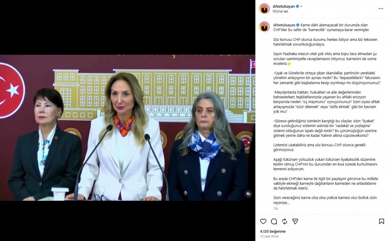 AK Parti Genel Başkan Yardımcısı Fatma Betül Sayan Kaya, "Karne dahi alamayacak bir durumda olan CHP'liler bu sefer de 'karnecilik' oynamaya karar vermişler." dedi.