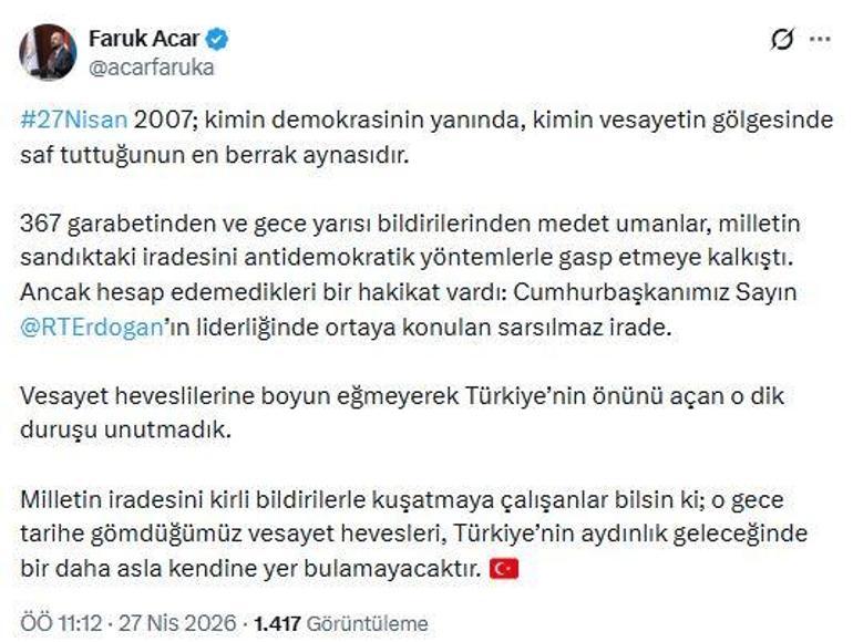 AK Parti'li Acar, sanal medya hesabından yaptığı açıklamada, "27 Nisan 2007; kimin demokrasinin yanında, kimin vesayetin gölgesinde saf tuttuğunun en berrak aynasıdır. 367 garabetinden ve gece yarısı bildirilerinden medet umanlar, milletin sandıktaki iradesini antidemokratik yöntemlerle gasp etmeye kalkıştı. Ancak hesap edemedikleri bir hakikat vardı. Cumhurbaşkanımız Sayın Recep Tayyip Erdoğan’ın liderliğinde ortaya konulan sarsılmaz irade. Vesayet heveslilerine boyun eğmeyerek Türkiye’nin önünü açan o dik duruşu unutmadık. Milletin iradesini kirli bildirilerle kuşatmaya çalışanlar bilsin ki o gece tarihe gömdüğümüz vesayet hevesleri, Türkiye’nin aydınlık geleceğinde bir daha asla kendine yer bulamayacaktır" ifadelerini kullandı.