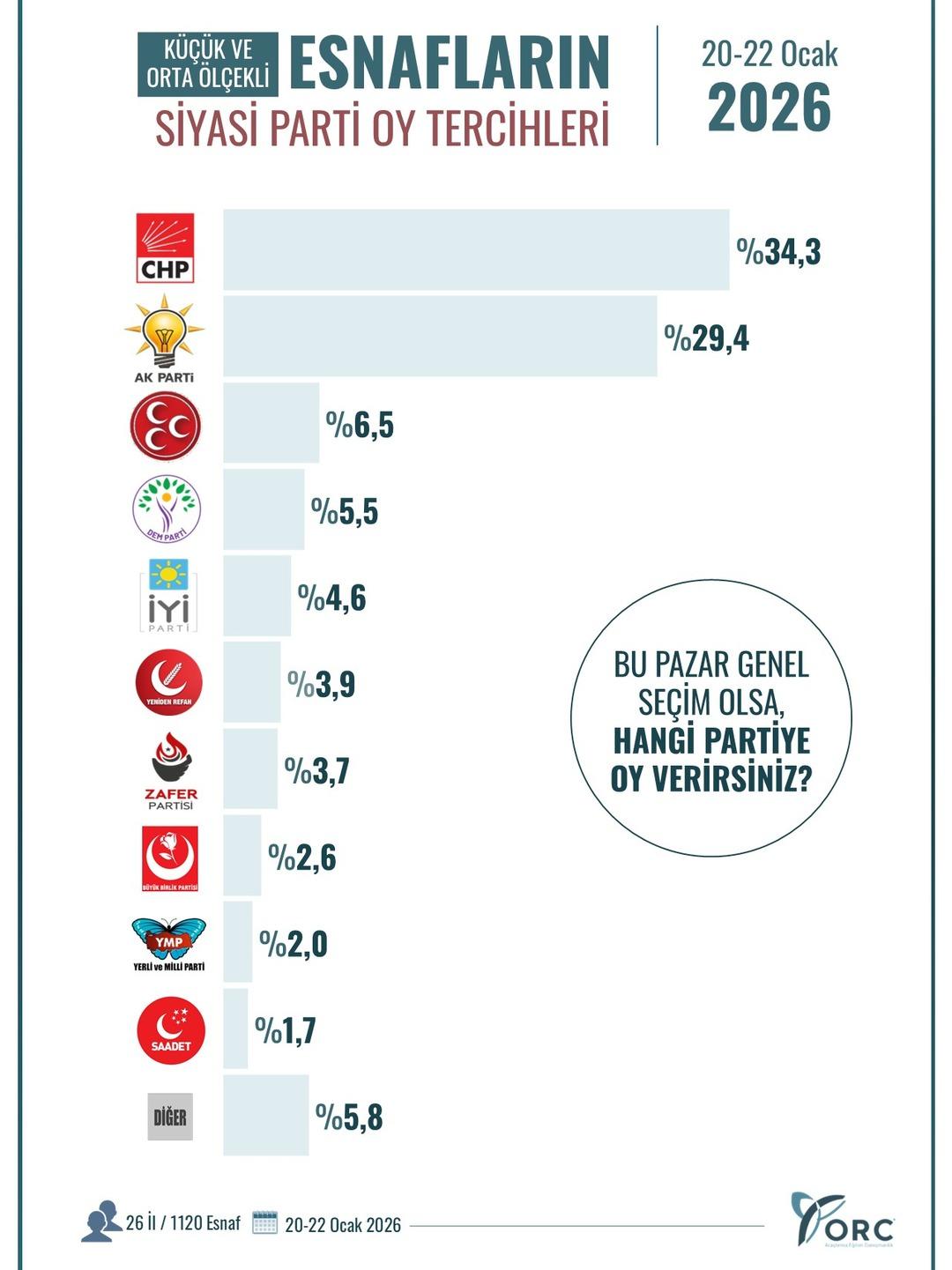 Bin 100 küçük ve orta ölçekli esnafın katıldığı ankette birinci sırada CHP çıktı. Ankette yüzde 34,3 oy oranına ulaşan CHP, yüzde 29,4 oy oranına ulaşan AK Parti'nin önünde. Esnaf anketinde iki parti arasındaki fark yüzde 4,9 oldu.