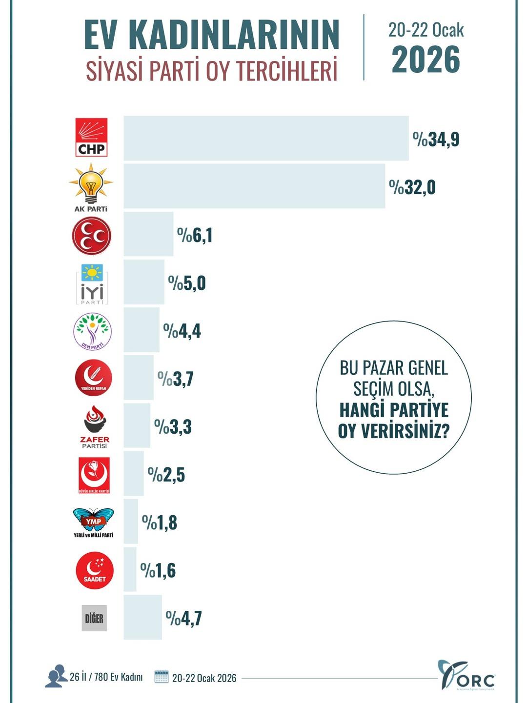 780 ev kadınının katıldığı ankette de CHP birinci sırada çıktı. Ev kadınlarının yüzde 34,9'u CHP'ye oy vereceklerini bildirdi. AK Parti ise yüzde 32 ile CHP'nin 2,9 puan gerisinde yer aldı.