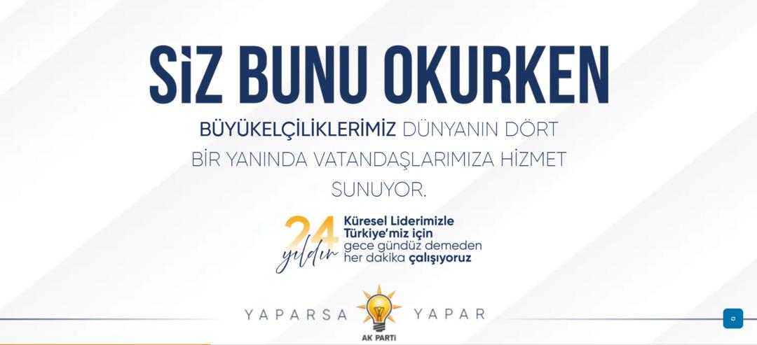AK Parti Tanıtım ve Medya Başkanlığı, partinin iktidara gelişinin 23. yıl dönümü dolayısıyla, Türkiye genelinde bir açık hava kampanyası başlattı. Çalışmanın, Cumhurbaşkanı ve AK Parti Genel Başkanı Recep Tayyip Erdoğan’ın “durmadan çalışan Türkiye” vizyonunu yansıtacağı belirtildi. AK Parti’nin “laf değil, icraat siyaseti” yaklaşımını sade, etkili ve çağın iletişim gereksinimlerine uygun biçimde yeniden ele almayı hedeflediği ifade edildi.