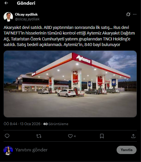 Gazeteci Olcay Aydirek'in X'te yaptığı paylaşıma göre akaryakıt devi Aytemiz satıldı. Aydirek, paylaşımında şu ifadeleri kullandı: