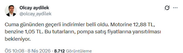 MOTORİNDEKİ İNDİRİM 12 LİRAYI BULACAKGazeteci Olcay Aydilek, sosyal medya hesabından yaptığı paylaşımda "Cuma gününden geçerli indirimler belli oldu. Motorine 12,88 TL, benzine 1,05 TL. Bu tutarların pompa satış fiyatlarına yansıtılması bekleniyor" ifadelerini kullandı.