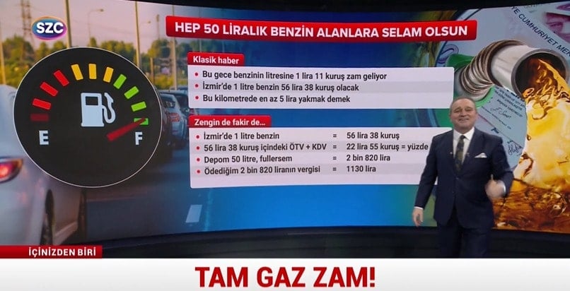 - Bu gece benzinin litresine 1 lira 11 kuruş zam geliyor. Artık bu tip cümleleri kanıksadık. Bunu daha somut hale getirmek lazım.