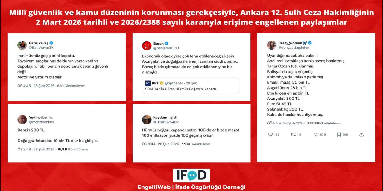 O paylaşımlar millî güvenlik ve kamu düzeninin korunması gerekçesiyle, Ankara 12. Sulh Ceza Hakimliğinin 2 Mart 2026 tarihli ve 2026/2388 sayılı kararıyla erişime engellendi.
