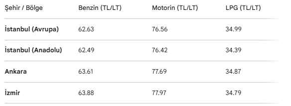 GÜNCEL AKARYAKIT FİYATLARIÇifte zam sonrası büyükşehirlerde oluşan güncel pompa fiyatları şu şekildedir:
