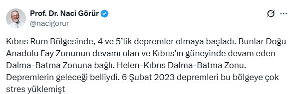 Akdeniz'de art arda meydana gelen 3 deprem endişe yaratırken konuyla ilgili açıklama ise Prof. Dr. Naci Görür'den geldi. X hesabından depremlerle ilgili açıklama yapan Görür "Kıbrıs Rum Bölgesinde, 4 ve 5'lik depremler olmaya başladı. Bunlar Doğu Anadolu Fay Zonunun devamı olan ve Kıbrıs'ın güneyinde devam eden Dalma-Batma Zonuna bağlı.