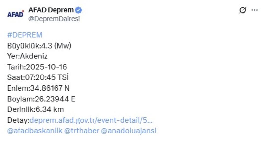 Afet ve Acil Durum Yönetimi Başkanlığının (AFAD) internet sitesinde yer alan bilgiye göre, saat 07.20'de merkez üssü Akdeniz olan 4,3 büyüklüğünde sarsıntı kaydedildi.
