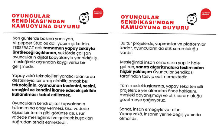Oyuncular Sendikası, tamamen yapay zekâ ile üretileceği açıklanan 'Tesseract' projesi hakkında kapsamlı bir açıklama yayımladı. Sendika, Akın Akınözü ve Özcan Deniz’in ses ve görüntülerinin kullanıldığı, bu yapay zekâ projesinin oyunculuk mesleğinin geleceği için ciddi riskler taşıdığını paylaşmıştı.