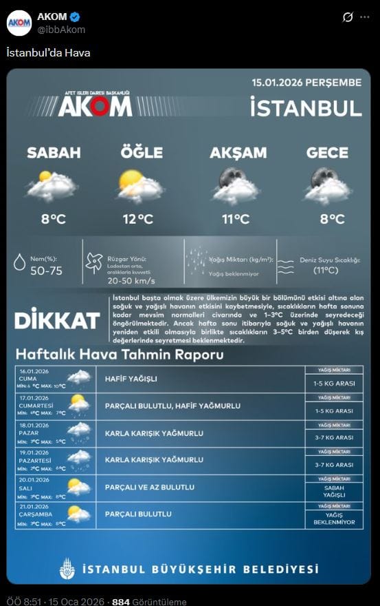 AKOM'dan yapılan açıklamada, "İstanbul başta olmak üzere ülkemizin büyük bir bölümünü etkisi altına alan soğuk ve yağışlı havanın etkisini kaybetmesiyle, sıcaklıkların hafta sonuna kadar mevsim normalleri civarında ve 1–3°C üzerinde seyredeceği öngörülmektedir. Ancak hafta sonu itibarıyla soğuk ve yağışlı havanın yeniden etkili olmasıyla birlikte sıcaklıkların 3–5°C birden düşerek kış değerlerinde seyretmesi beklenmektedir." ifadelerine yer verildi.