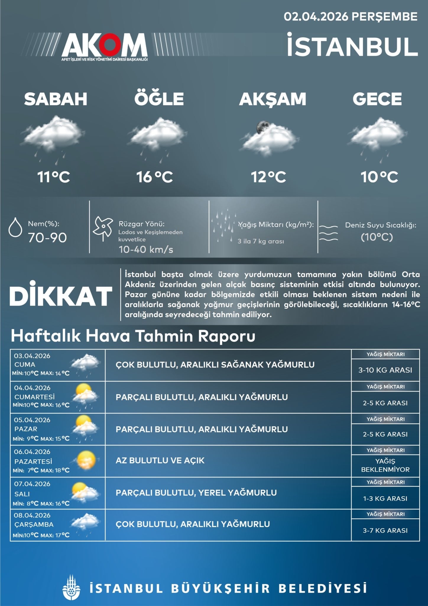 İstanbul Büyükşehir Belediyesi (İBB) Afet Koordinasyon Merkezi (AKOM), haftalık hava tahmin raporunu paylaştı.