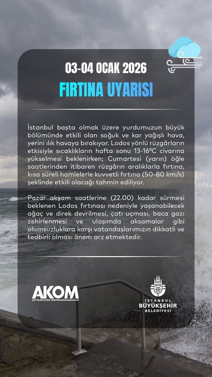 AKOM bugün İstanbul için yeni bir uyarıda bulundu. Yapılan uyarıda soğuk ve kar yağışlı havanın yerini ılık havalara bıraktığı, lodos nedeni ile sıcaklıkların hafta sonu 13-16 derecelere kadar çıkmasının beklendiği ifade edildi.