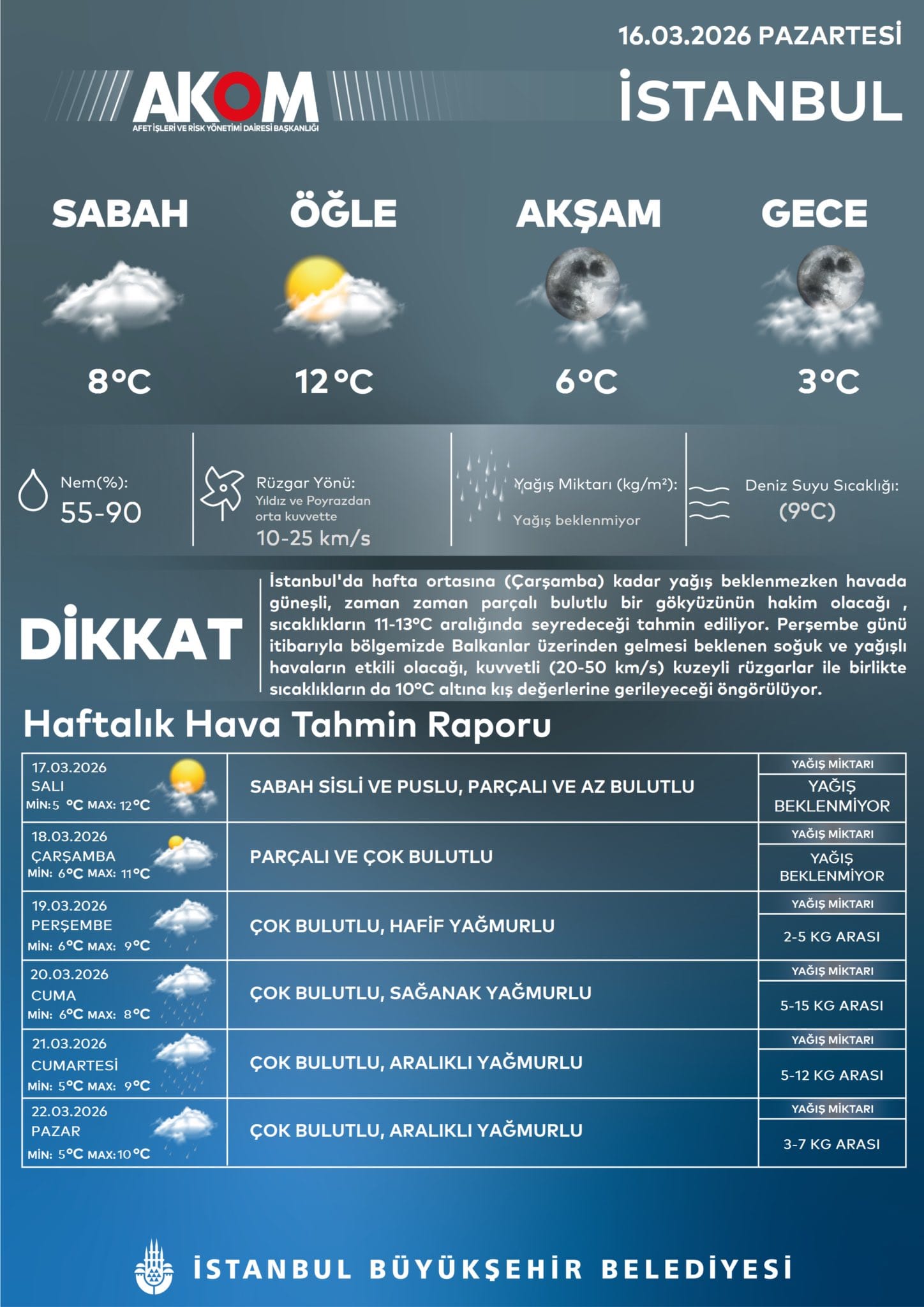 İstanbul Büyükşehir Belediyesi Afet Koordinasyon Merkezi (AKOM), haftalık hava tahmin raporunu yayımlayarak İstanbulluları arife günü olan perşembe gününden itibaren etkili olacak soğuk havaya karşı uyardı. Haftanın ilk yarısında bahar havası yaşanırken, hafta sonuna doğru kış değerlerine geri dönülecek.