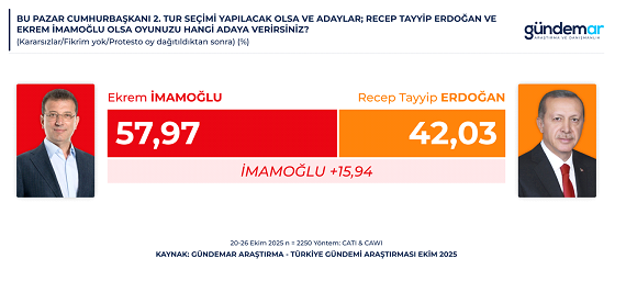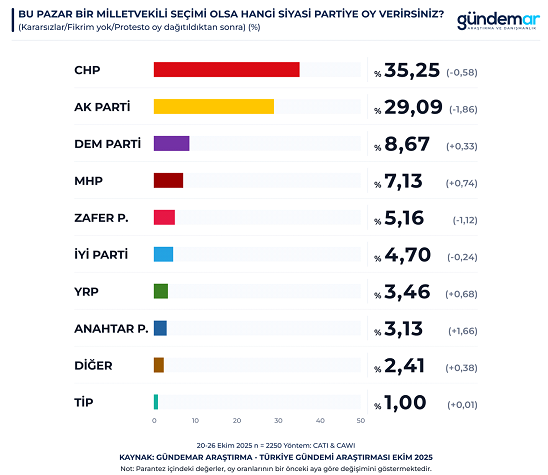 SON ANKETTE BUHRAN: AKP YÜZDE 30'UN ALTINA DÜŞTÜ!GÜNDEMAR Araştırma’nın 20-26 Ekim 2025 tarihleri arasında 2250 kişiyle gerçekleştirdiği Türkiye Gündemi araştırmasına göre AKP resmen yüzde 30'un altını gördü. Araştırmaya göre: Kararsızlar, fikrim yok ve protesto oyların oransal olarak dağıtılmasının ardından CHP yüzde 35,25 ile birinci parti konumunu sürdürüyor. AKP yüzde 29,09 ile ikinci sırada yer alırken, DEM Parti yüzde 8,67, MHP yüzde 7,13, Zafer Partisi yüzde 5,16, İYİ Parti yüzde 4,70, Yeniden Refah Partisi yüzde 3,46, Anahtar Parti yüzde 3,13, diğer partiler yüzde 2,41 ve TİP yüzde 1,00 oranında destek buluyor.