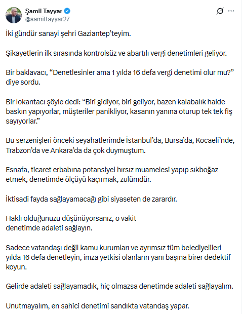 "Bir baklavacı, “Denetlesinler ama 1 yılda 16 defa vergi denetimi olur mu?” diye sordu.