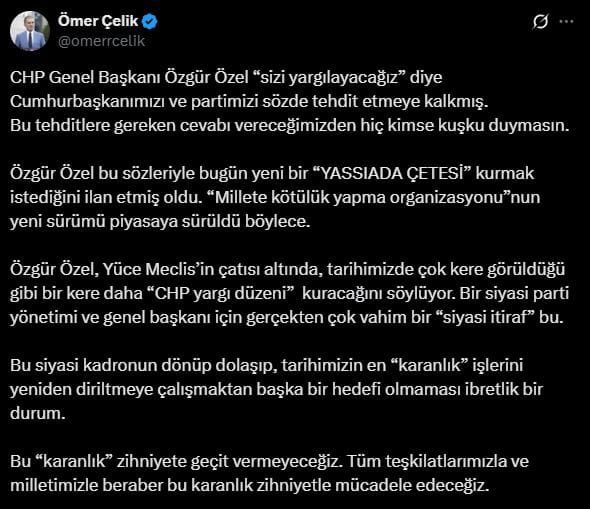 "CHP Genel Başkanı Özgür Özel 'sizi yargılayacağız' diye Cumhurbaşkanımızı ve partimizi sözde tehdit etmeye kalkmış. Bu tehditlere gereken cevabı vereceğimizden hiç kimse kuşku duymasın. Özgür Özel bu sözleriyle bugün yeni bir 'Yassıada çetesi' kurmak istediğini ilan etmiş oldu. 'Millete kötülük yapma organizasyonu'nun yeni sürümü piyasaya sürüldü böylece.
