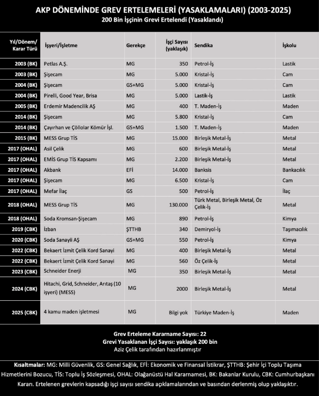 Ancak 2003-2025 yılları arasında yaklaşık 200 bin işçinin grev hakkı, 'erteleme' kararlarıyla engellenmişti.