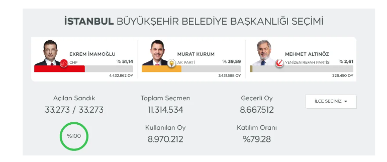 İMAMOĞLU YÜZDE 51'LİK ORANLA KAZANMIŞTI2024’teki İBB seçimlerinde Murat Kurum yüzde 39,59 oy almıştı. Ekrem İmamoğlu ise 1 milyon oy fark atarak yüzde 51,14 ile seçimi büyük farkla kazanmıştı. AKP’nin şu anki oy oranı olan yüzde 41,7 (2026) ile İBB seçimleri bugün yapılsa yine seçimi kaybedeceği anlaşıldı.