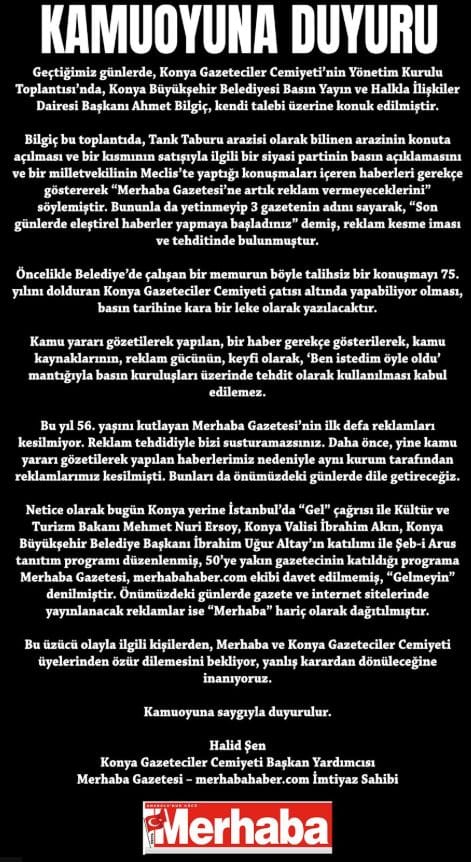 "Öncelikle Belediye’de çalışan bir memurun böyle talihsiz bir konuşmayı 75. yılını dolduran Konya Gazeteciler Cemiyeti çatısı altında yapabiliyor olması, basın tarihine kara bir leke olarak yazılacaktır. Kamu yararı gözetilerek yapılan, bir haber gerekçe gösterilerek, kamu kaynaklarının, reklam gücünün, keyfi olarak, ‘Ben istedim öyle oldu’ mantığıyla basın kuruluşları üzerinde tehdit olarak kullanılması kabul edilemez. Bu yıl 56. yaşını kutlayan Merhaba Gazetesi’nin ilk defa reklamları kesilmiyor. Reklam tehdidiyle bizi susturamazsınız. Daha önce, yine kamu yararı gözetilerek yapılan haberlerimiz nedeniyle aynı kurum tarafından reklamlarımız kesilmişti."