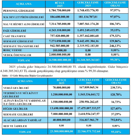 Bütçe tarafında sermaye transferlerinin yıl içinde planlanan tutarın üzerinde gerçekleştiği, gerçekleşmenin planlamaya kıyasla %246 seviyesine ulaştığı görüldü. Gelir tarafında ise “bağış ve özel gelirler” kaleminde 1,5 milyar TL tahsilat öngörülmesine karşın yaklaşık 250 milyon TL seviyesinde gerçekleşme olduğu, bunun oran olarak %16’ya karşılık geldiği belirtildi. Gelir açığının finansmanı kapsamında yıl içinde yaklaşık 1 milyar TL tutarında kredi kullanıldığı bilgisi de dikkat çekti.