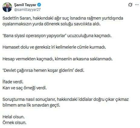 Saran'ın yaşadığı süreçle ilgili AKP cephesinden ilk açıklama eski milletvekili Şamil Tayyar'dan geldi.