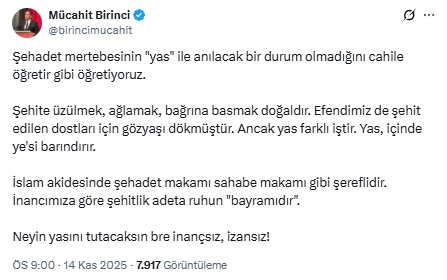 Mücahit Birinci'nin söz konusu paylaşımı şöyle: