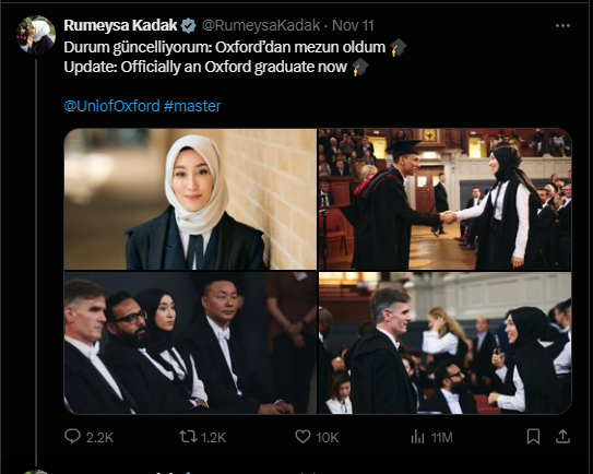 MEZUNİYETİNİ 'MÜJEDELEMİŞTİ'Bu astronomik burslardan yararlanan az sayıda isimden biri olan AKP İstanbul Milletvekili Rumeysa Kadak İngiltere'nin en prestijli okullarından olan Oxford Üniversitesi'nden mezun olduğunu "müjdelemişti"