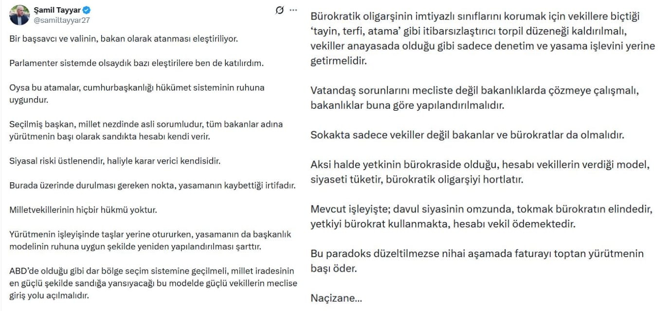Tartışmalara ilişkin açıklama yapan eski AKP Gaziantep Milletvekili Şamil Tayyar, başkanlık sistemini eleştirdi.