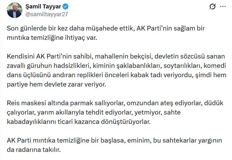 AKP'nin içinde 'kendisini partinin sahibi, mahallenin bekçisi, devletin sözcüsü sanan zavallı bir güruh' olduğunu belirten Tayyar, "Sağlam bir mıntıka temizliğine ihtiyaç var" dedi.
