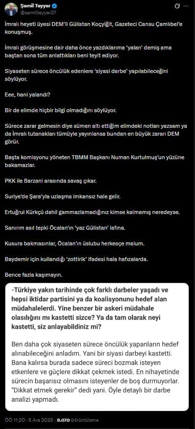 AKP'Lİ ŞAMİL TAYYAR "FAZLA KAŞIMAYIN" DİYEREK DEM'İ UYARDIİmralı görüşmesine ilişkin tartışmalar sürerken AKP'li eski milletvekili Şamil Tayyar, darbe sözlerinin hedefinde Devblet Bahçeli'nin olduğunu iddia etmiş AKP içinde tepkilere neden olmuştu. Tayyar'ın iddiasına Gazeteci Cansu Çamlıbel’e verdiği röportajda yanıt veren Koçyiğit ise Bahçeli'nin hedeflenmediğini ifade ederek şunları söyledi: