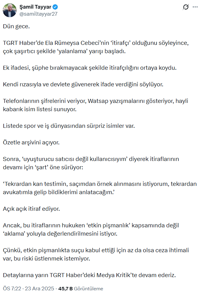 AKP'li eski vekil Şamil Tayyar, İstanbul Cumhuriyet Başsavcılığı tarafından yürütülen uyuşturucu operasyonu kapsamında tutuklanan spiker Ela Rumeysa Cebeci hakkındaki iddialarını sürdürüyor.