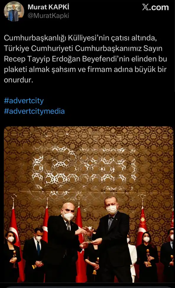 “Cumhurbaşkanımız Sayın Recep Tayyip Erdoğan Beyefendi’nin elinden bu plaketi almak şahsım ve firmam adına büyük bir onurdur” ifadeleriyle paylaşmıştı.
