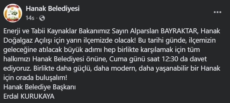 Hanak halkı, ilçenin tarihinde bir ilk olacak doğalgazın verileceği günü bekliyordu. Hanak Belediye Başkanı Erdal Kurukaya, dün yaptığı bir açıklamayla, "Enerji ve Tabii Kaynaklar Bakanımız Sayın Alparslan Bayraktar, Hanak Doğalgaz Açılışı için yarın ilçemizde olacak! Bu tarihi günde, ilçemizin geleceğine atılacak büyük adımı hep birlikte karşılamak için tüm halkımızı Hanak Belediyesi önüne, Cuma günü saat 12:30 da davet ediyoruz" diyerek tüm ilçe sakinlerini bu önemli etkinliğe çağırmıştı.