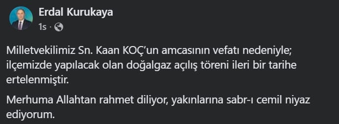 "Milletvekilimiz Sn. Kaan KOÇ’un amcasının vefatı nedeniyle; ilçemizde yapılacak olan doğalgaz açılış töreni ileri bir tarihe ertelenmiştir. Merhuma Allahtan rahmet diliyor, yakınlarına sabr-ı cemil niyaz ediyorum."